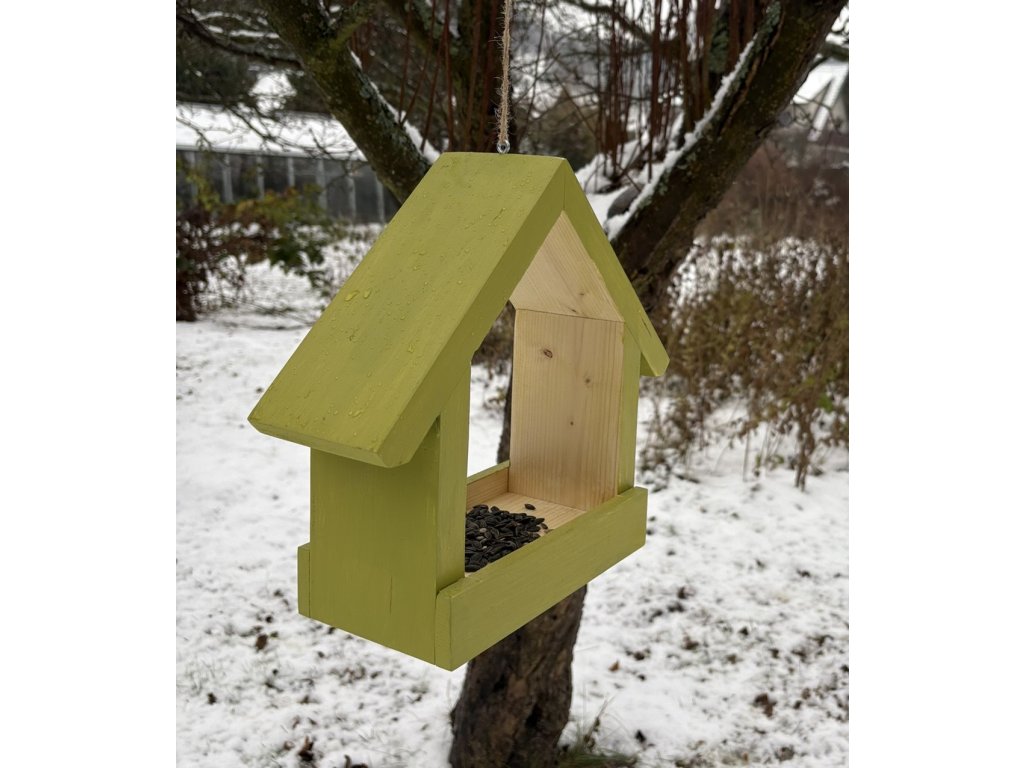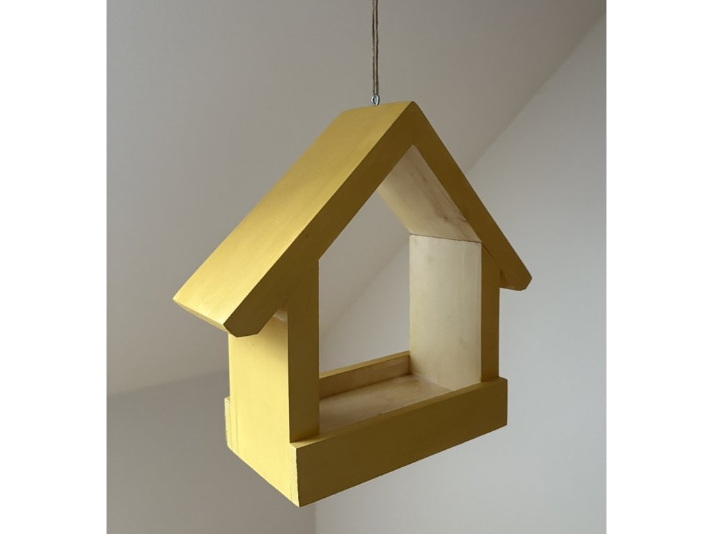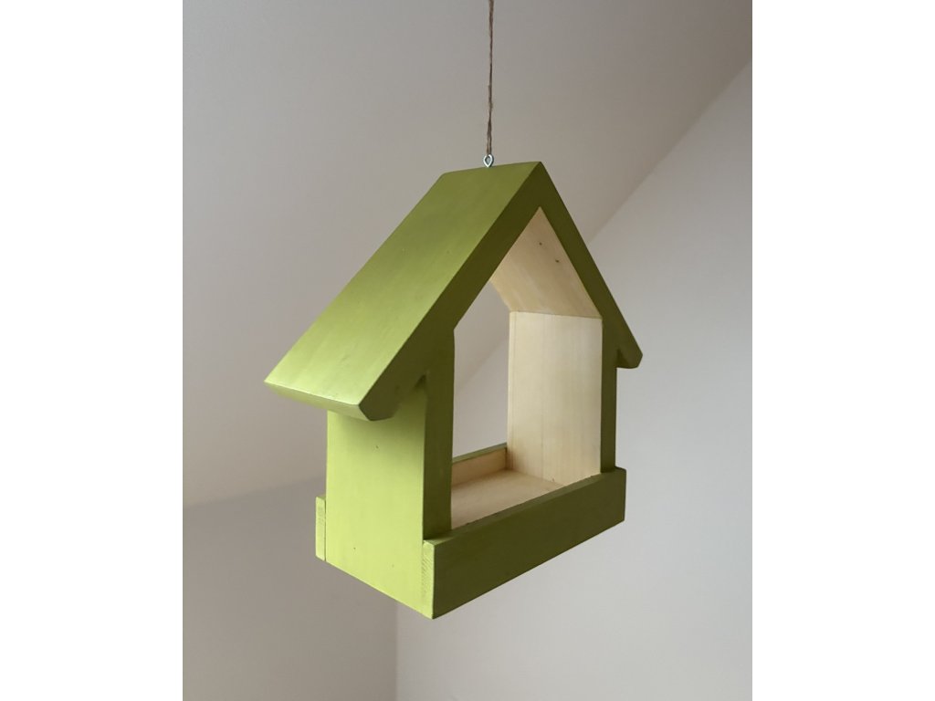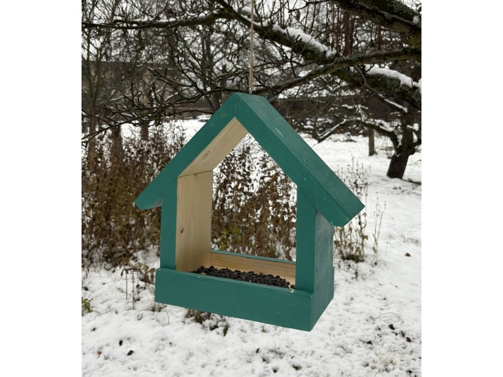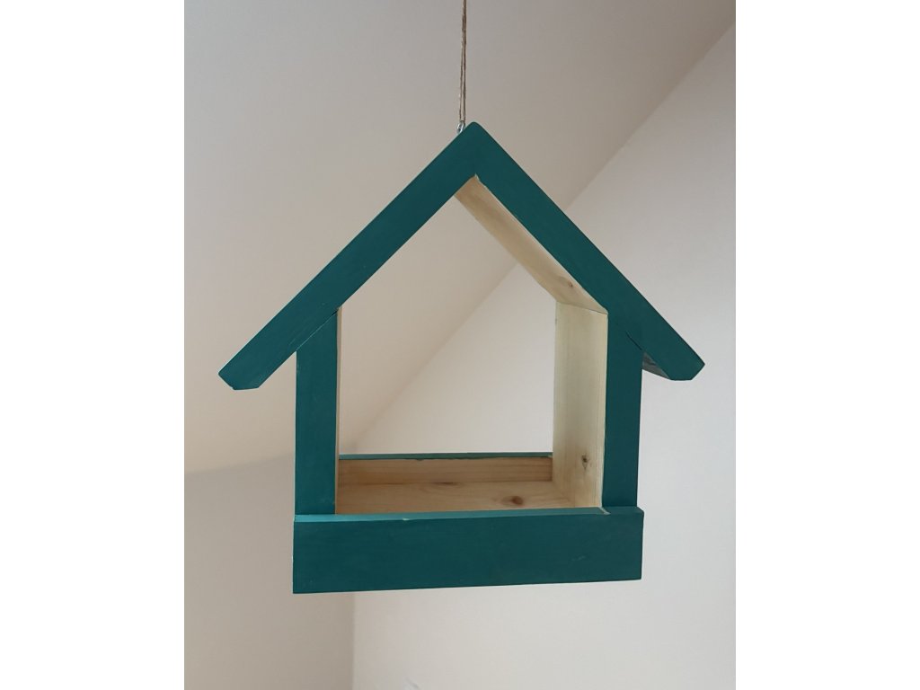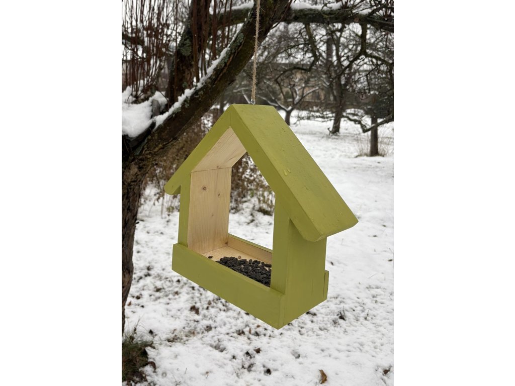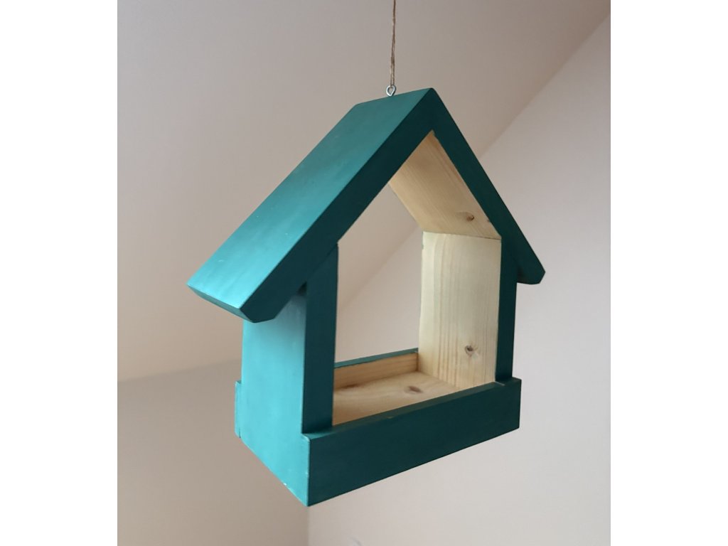 Toto ručně vyrobené krmítko je zhotoveno ze smrkového masivního dřeva, díky čemuž je lehké, odolné a vhodné pro venkovní použití. Povrch je ošetřen barevným nátěrem, který krmítku dodává příjemný vzhled a zároveň chrání dřevo před počasím.